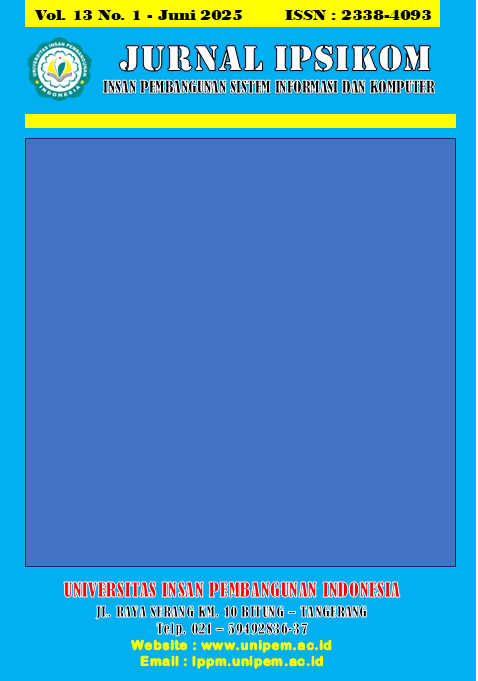 Vol. 13 No. 1 (2025)Jurnal Insan Pembangunan Sistem Informasi dan Komputer (Jurnal IPSIKOM) diterbitkan oleh LPPM Universitas Insan Pembangunan Indonesia merupakan keilmuan bidang komputer yang memuat tulisan-tulisan ilmiah mengenai hasil penelitian murni dan terapan di bidang bidang Sistem Informasi, Teknologi Informasi, Software Engineering dan Computer Science serta ulasan-ulasan mengenai perkembangan teori, metode dan ilmu-ilmu terapan terkait. Jurnal IPSIKOM diterbitkan 2 (dua) kali dalam satu tahun pada bulan Juni dan Desember. Redaksi mengundang para peneliti, praktisi dan Mahasiswa